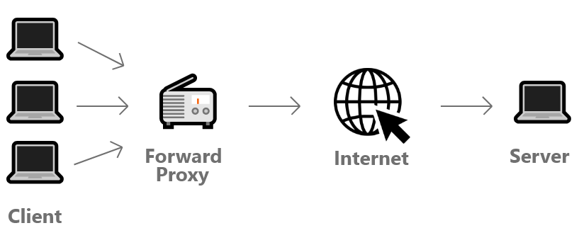 Forward Proxy๋ ์ธํฐ๋ท์ ์ฐ๊ฒฐํ๊ธฐ ์ ์ ํ๋ก์ ์๋ฒํํ ์์ฒญ์ ํ๊ณ ํ๋ก์ ์๋ฒ๊ฐ ์ค์ ์๋ฒ๋ก ์์ฒญ์ ํ ํ ํด๋ผ์ด์ธํธ์๊ฒ ๊ฒฐ๊ณผ๋ฅผ ์ ๋ฌํด์ค๋ค.