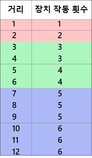 ์ด ํ๋ฅผ ๋ณด๋ฉด ๊ท์น์ด ๋์ ๋ณด์ธ๋ค. ์๊น๋ณ๋ก n๊ตฐ์ ์ก์๋ณด๋ฉด ์ฒซ๋ฒ์งธ ๊ตฐ์ ์์ ๊ฐ์๊ฐ 2๊ฐ, ๋๋ฒ์งธ ๊ตฐ์ 4๊ฐ, ์ธ๋ฒ์งธ ๊ตฐ์ 6๊ฐ ์ด๋ ๋ฏ n๊ตฐ ์์ ์ด 2n๊ฐ๊ฐ ๋ค์ด์๋ค. ์ด๋ฅผ ์ด์ฉํ์ฌ, ๊ฑฐ๋ฆฌ๊ฐ ์ด๋ ๊ตฐ์ ์๋์ง๋ฅผ ๊ตฌํ๋ค. ์ด๋ ๊ฒ n์ ๊ตฌํ ํ ๊ฐ ๊ตฐ์ ์ ๋ณด๋ฉด ๋ฑ ๋ฐ์ผ๋ก ๋๋๋ ๊ฒ์ ๋ณผ ์ ์๋ค. ์ด๋ฅผ ์ด์ฉํ์ฌ ๊ฑฐ๋ฆฌ๊ฐ ๊ตฐ์์ ๊ณผ๋ฐ์ ๋์ด๊ฐ๋ฉด 2n์ ์ถ๋ ฅ , ๊ทธ๋ ์ง ์์ผ๋ฉด 2n - 1์ ์ถ๋ ฅํ๋ค !